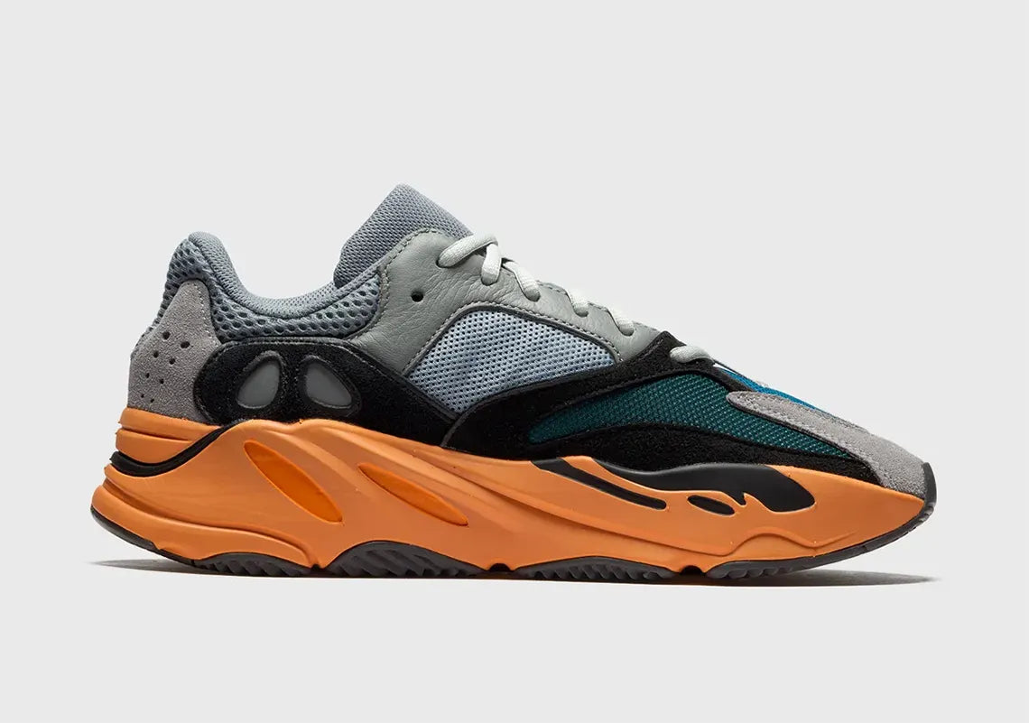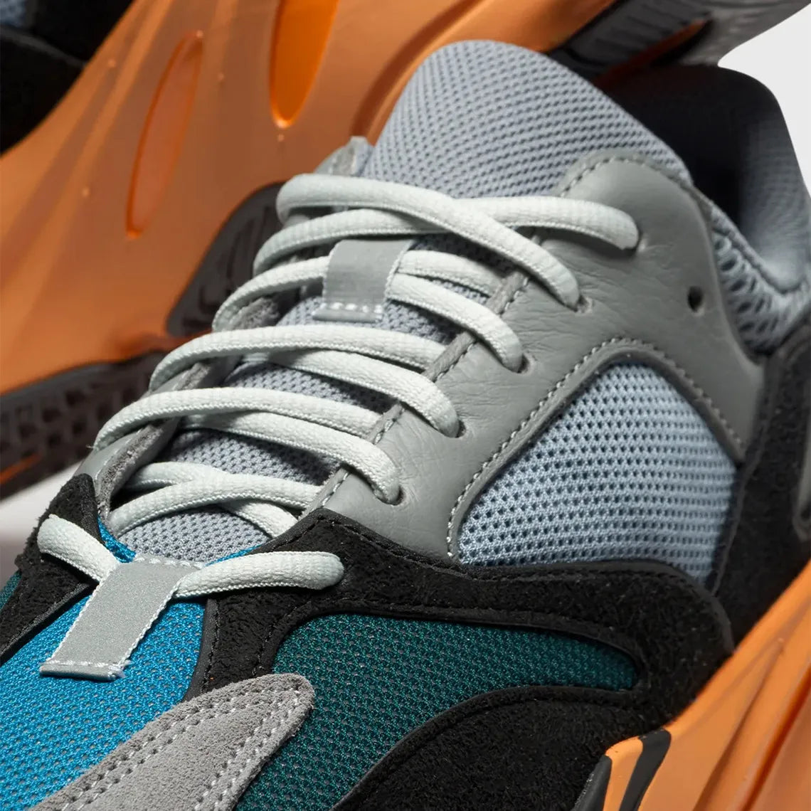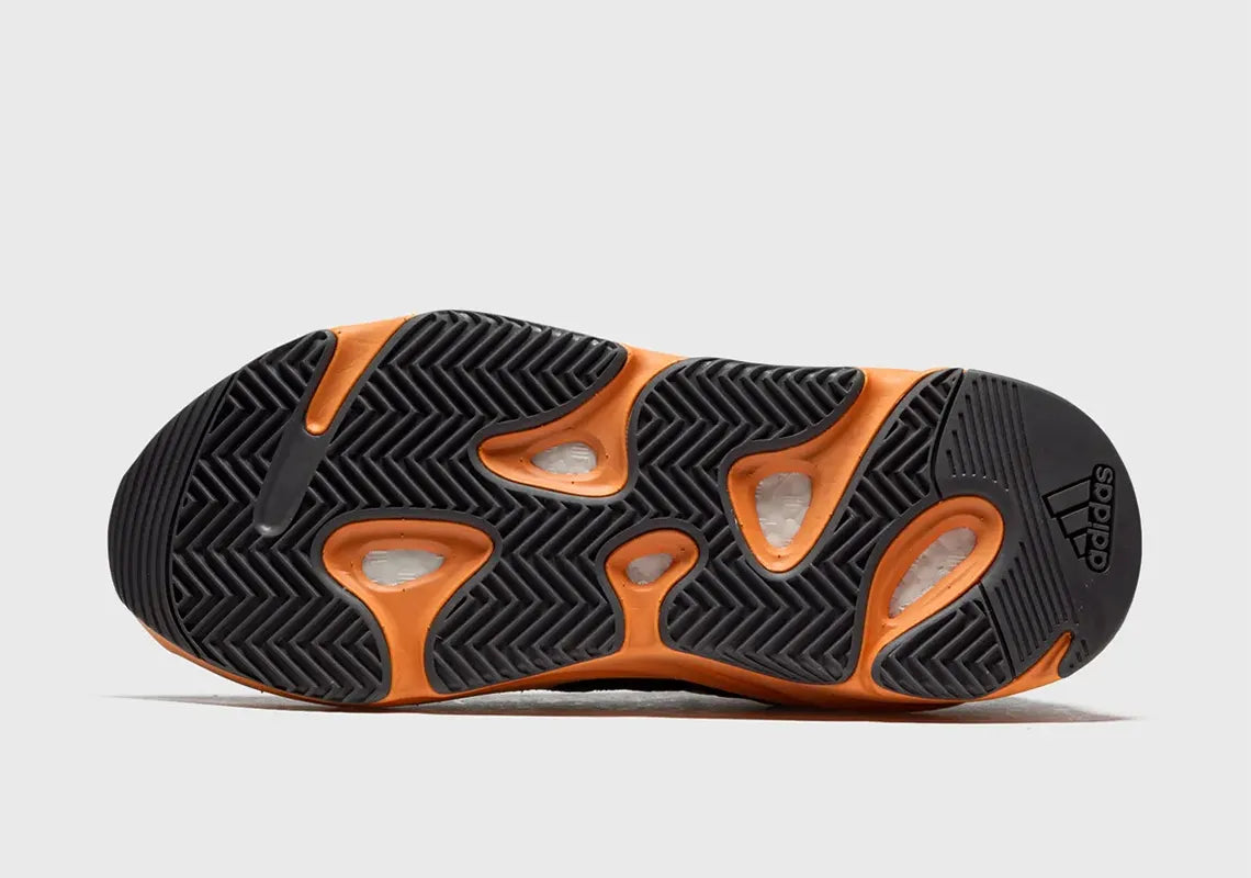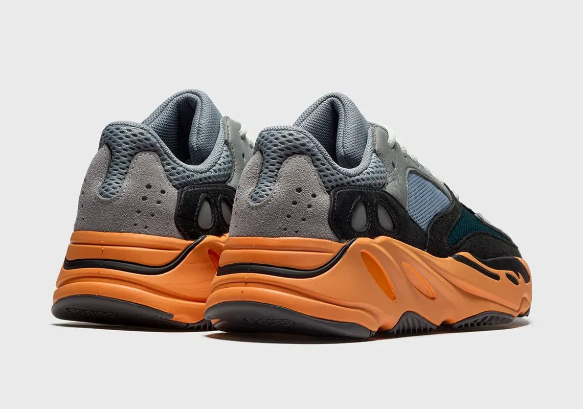 A bold Wash Orange Boost midsole anchors the design, creating a high-impact contrast against the cooler tones of the upper. The chunky sole delivers the classic Yeezy 700 aesthetic, blending retro runner vibes with modern comfort. Underfoot, a durable rubber outsole ensures traction and stability.