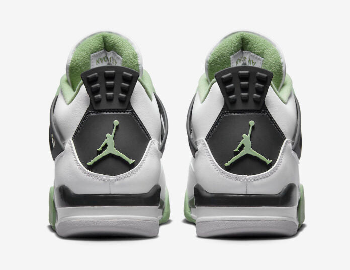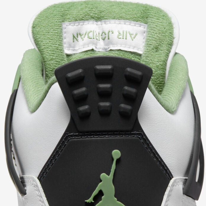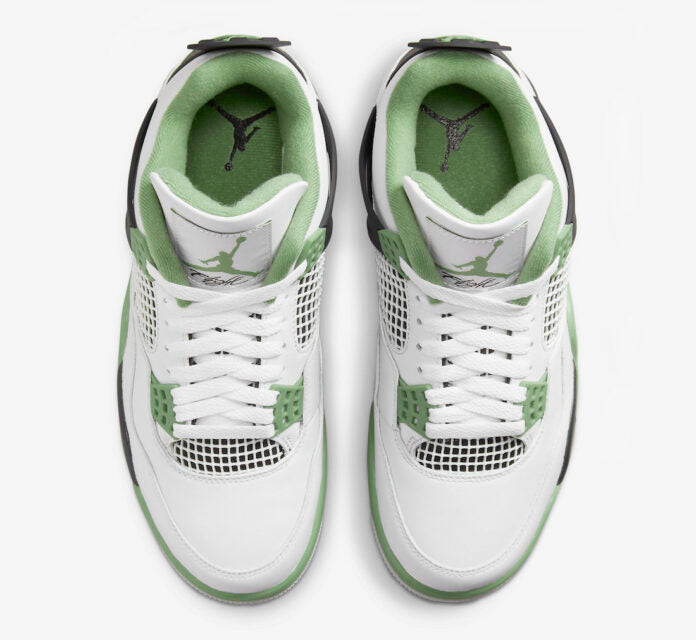 The upper features smooth white leather across the base, paired with bold black hits on the midsole, wings, and heel tab. Soft Seafoam green accents energize the look, appearing on the eyelets, mudguard, sock lining, and both the tongue and heel branding. Classic AJ4 elements like the mesh panels, visible Air unit, and sculpted midsole deliver the signature comfort and structure the model is known for.